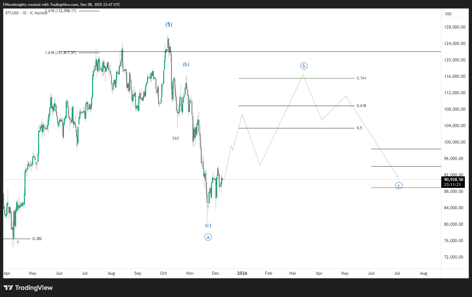 If BTCUSD continues to trace out the remaining c–d–e swings inside the pattern, the expectation would be for volatility to compress further into mid‑range before cycle wave IV completes. Once a final e‑wave low forms without breaking the major support cluster, Elliott Wave guidelines anticipate a strong directional move in cycle wave V, with upside potential toward or beyond the upper parallel of the long‑term channel and Fibonacci extension targets measured from prior impulse legs.