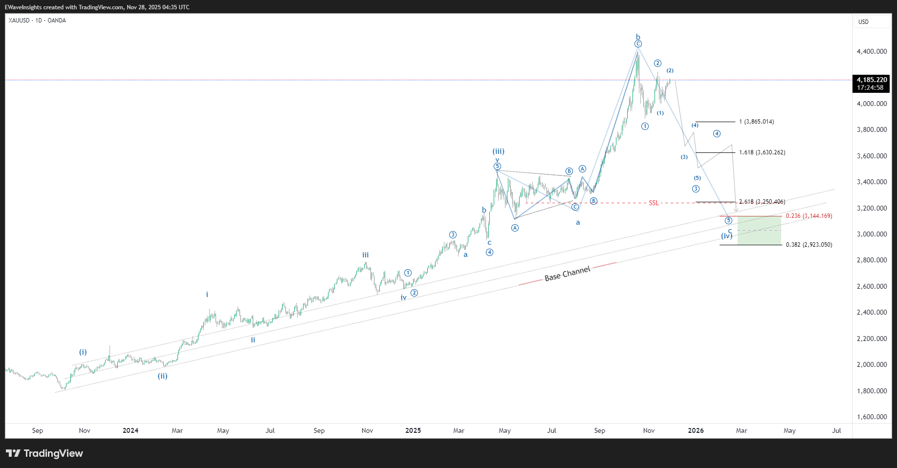 On the daily chart, the impulsive rally from the base channel has already delivered a strong five‑wave advance, with wave (iii) extended and followed by a broad, overlapping correction. That correction is counted as an expanding flat: wave A down, wave B breaking to a new high at 4,381.27, and a still‑developing wave C decline projected to unfold next. Momentum has already started to diverge against price on this last leg, consistent with a maturing B‑wave blow‑off.