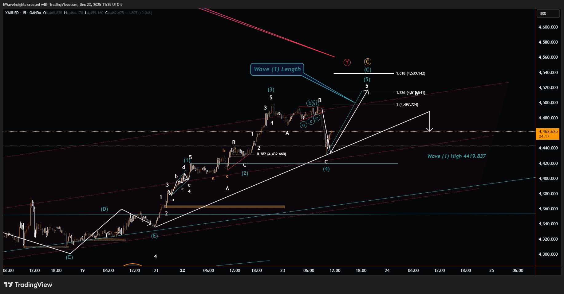 On the 15‑minute chart, GOLD (XAUUSD) continues to grind higher within the current impulse, with price now working through wave (5) of this sequence. Wave (4) has reacted cleanly from support, holding above the prior wave (1) high at 4419.837, which keeps the impulsive structure in GOLD (XAUUSD) intact and validates the immediate bullish bias.​​