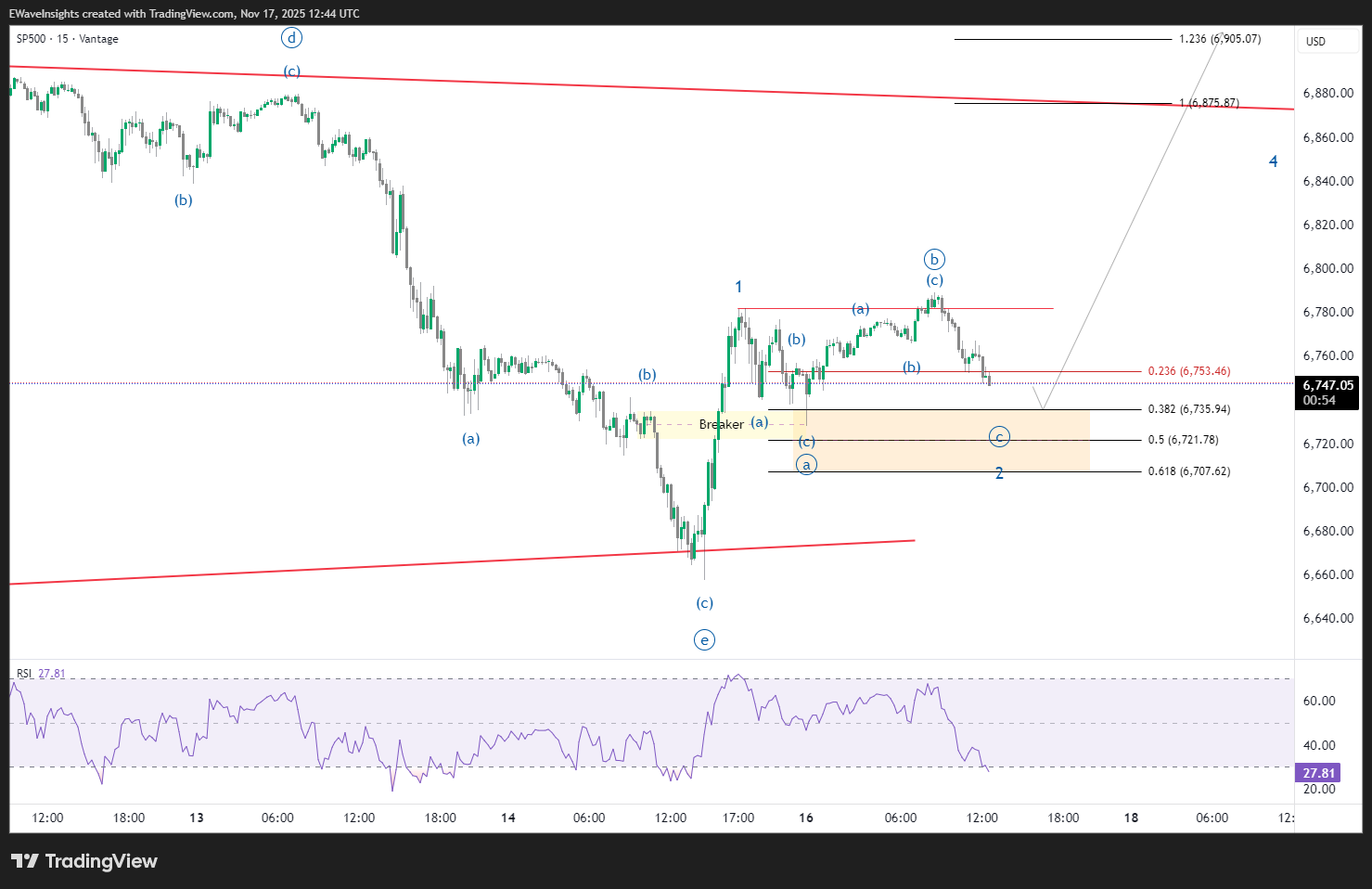 Given that wave B unfolded as an expanding flat, the triangle remains the dominant scenario as long as price respects the established red trendlines. If wave D develops as expected, resistance is likely in the 6,814–6,858 region a potential area for a reversal or at least a pause in upward momentum. Should resistance hold, a rejection from this zone could set up a subsequent move lower into the primary wave E target zone below 6,753, as highlighted by the updated Fibonacci levels. This evolving pattern underscores the need to remain adaptive with Elliott Wave counts as new market evidence and price swings continue to emerge.